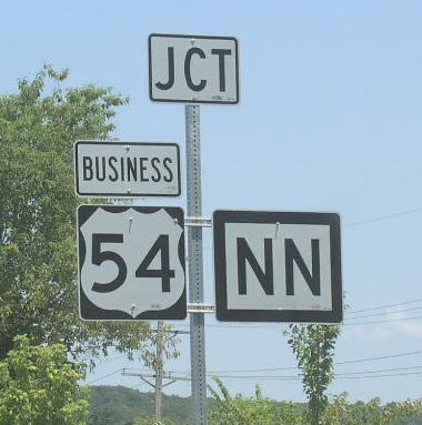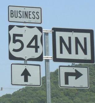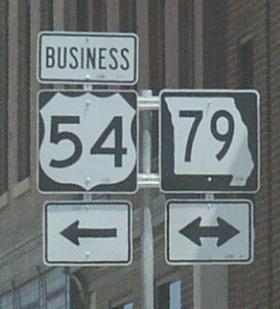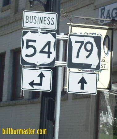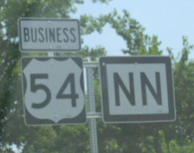 A junction marker on EB U.S. Rt. 54. EB BUSN U.S. Rt. 54/SB MO St Rt NN near Louisiana. EB BUSN U.S. Rt. 54 in Louisiana. EB BUSN U.S. Rt. 54/NB MO St Rt 79 in Louisiana.