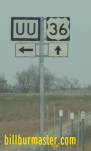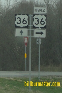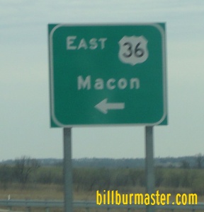Branches of U.S. Rt. 36 in Macon County. EB U.S. Rt. 36/SB MO St Rt 129 near the Linn/Macon County Line. EB U.S. Rt. 36/SB MO St Rt 129 east of MO Sec St Rt W. EB U.S. Rt. 36 east of MO St Rt 129. EB U.S. Rt. 36 west of MO St Rt 149. A BGS on NB MO St Rt 149. A BGS on SB MO Sec St Rt P. EB U.S. Rt. 36 east of New Cambria. EB U.S. Rt. 36 near the Chariton River. EB U.S. Rt. 36 east of Callao. EB U.S. Rt. 36 west of Bevier. A junction marker on NB MO Sec St Rt C. EB U.S. Rt. 36 west of Macon. EB U.S. Rt. 36 at Macon. A junction marker on SB U.S. Rt. 63. EB U.S. Rt. 36 east of U.S. Rt. 63.