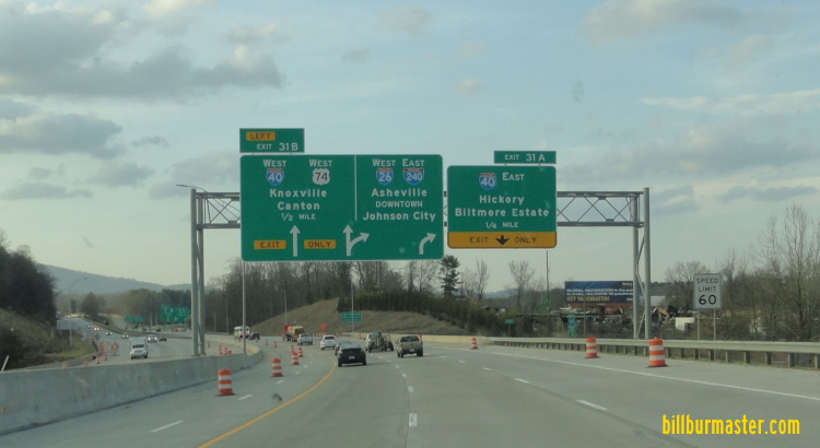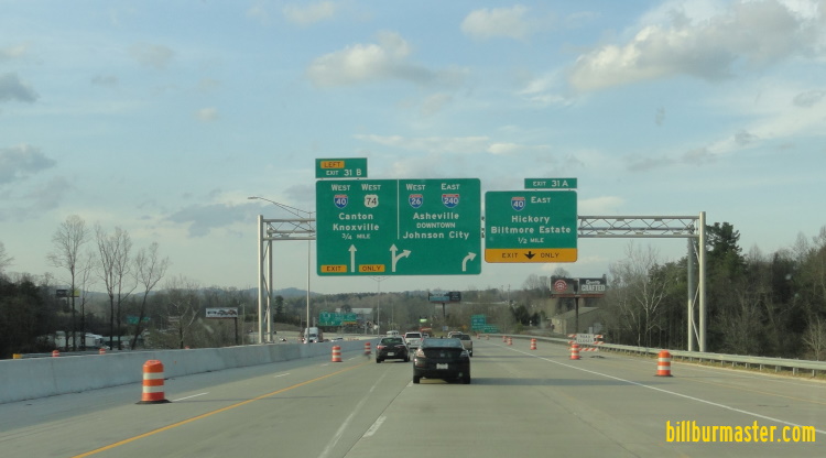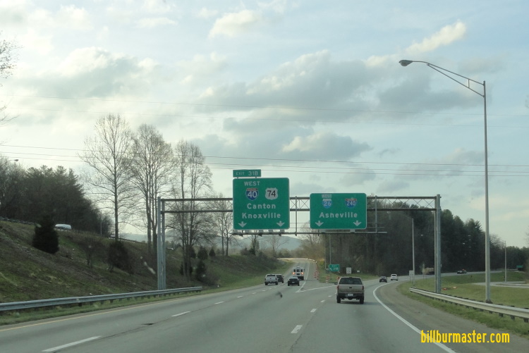 WB I-26/U.S. Rt. 74/TRUCK U.S. Rt. 64 at NC St Rt 146. WB I-26/U.S. Rt. 74/TRUCK U.S. Rt. 64 north of NC St Rt 146. WB I-26/U.S. Rt. 74/TRUCK U.S. Rt. 64 south of Blue Ridge Parkway. WB I-26/U.S. Rt. 74/TRUCK U.S. Rt. 64 at Blue Ridge Parkway. WB I-26/U.S. Rt. 74/TRUCK U.S. Rt. 64 south of NC St Rt 191. NB I-26 south of NC St Rt 191. WB I-26/U.S. Rt. 74/TRUCK U.S. Rt. 64 a half mile from EB I-40. (March, 2022) WB I-26/U.S. Rt. 74/TRUCK U.S. Rt. 64 a quarter mile from EB I-40. (March, 2022) WB I-26/U.S. Rt. 74/TRUCK U.S. Rt. 64 at EB I-40. (March, 2022) WB I-26/U.S. Rt. 74/TRUCK U.S. Rt. 64 at WB I-40. (March, 2022) A BGS on WB I-40. Photo Courtesy: Paul Dienhart WB I-40/U.S. Rt. 74/TRUCK U.S. Rt. 64 near Poles Creek, near Candler. WB I-40/U.S. Rt. 74/TRUCK U.S. Rt. 64 west of U.S. Rt. 19/23/74A. WB I-40/U.S. Rt. 74/TRUCK U.S. Rt. 64 east of U.S. Rt. 19/23/74A.