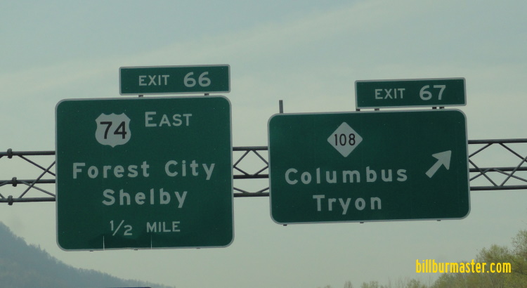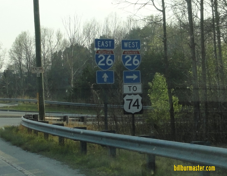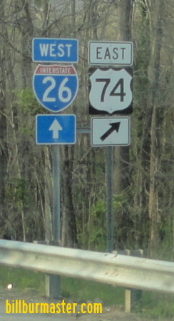 A BGS on WB I-26. A guide marker on EB NC St Rt 108. A guide marker on WB NC St Rt 108. WB I-26/U.S. Rt. 74 west of the Columbus Interchange. WB I-26/U.S. Rt. 74 west of Columbus. WB I-26/U.S. Rt. 74 near Howard Gap.