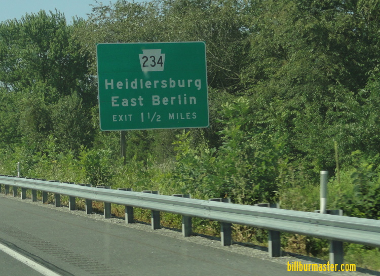 Pennsylvania State Route 234 is an east-west highway across Central Adams County. It runs from U.S. Rt. 30 , near Cashtown, to the York/Adams County Line, near East Berlin. PA St Rt 234 passes through the following towns in Adams County. Arendtsville Biglerville Heidlersburg East Berlin PA St Rt 234 is not multi-plexed in Adams County. PA St Rt 234 intersects the following highways in Adams County. U.S. Rt. 30, near Cashtown. Pennsylvania State Route 394, at Biglerville. Pennsylvania State Route 34, near Guernsety. U.S. Rt. 15, Heildersburg. Pennsylvania State Route 94, near Hampton. Pennsylvania State Route 194, at East Berlin.
