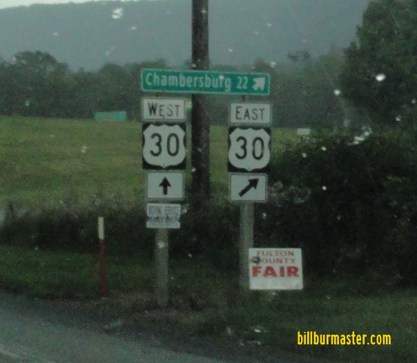 A guide marker on WB PA St Rt 16. A guide marker on NB U.S. Rt. 522. WB U.S. Rt. 30 west of Peach Orchard Road. WB U.S. Rt. 30 west of PA St Rt 655. WB U.S. Rt. 30 near of Saluvia. WB U.S. Rt. 30 west of Saluvia. WB U.S. Rt. 30 near Pump Station Road. WB U.S. Rt. 30 east of the Sildeling Hill State Forest Picnic Area. WB U.S. Rt. 30 east of PA St Rt 915. WB U.S. Rt. 30 at north PA St Rt 915. WB U.S. Rt. 30/SB PA St Rt 915 east of White Deer Drive. WB U.S. Rt. 30 west of PA St Rt 915.