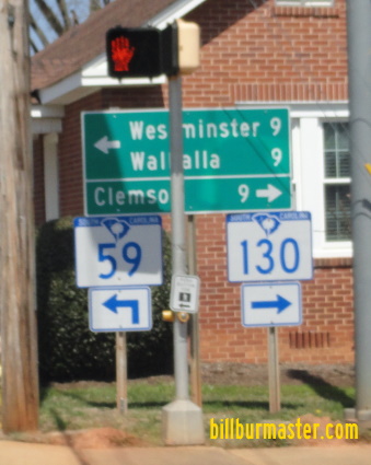 A junction marker on SB SC St Rt 59. A guide marker on SB SC St Rt 59. NB SC St Rt 130 at Fair Play Street. NB SC St Rt 130 east of Cherry Street. NB SC St Rt 130 south of U.S. Rt. 76/123; SC St Rt 28. A junction marker on WB U.S. Rt. 76/SC St Rt 28; SB U.S. Rt. 123.