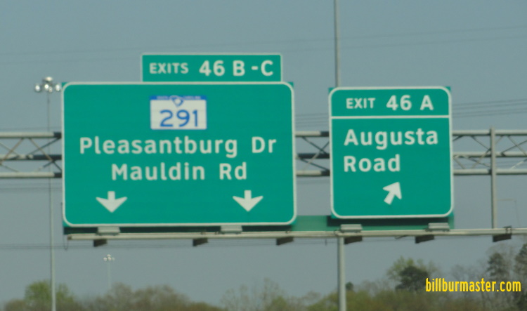 A BGS on NB I-85. A BGS on NB I-85. A BGS on NB I-85. A BGS on NB I-85. A BGS on NB I-385. A BGS on NB I-385. A BGS on NB I-385. NB SC St Rt 291 north of I-385. A guide marker on NB SC St Rt 291. A guide marker on NB SC St Rt 291.
