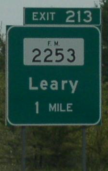Texas Farm-to-Market 2253 is a north-south highway in Eastern Bowie County. This highway runs from Texas Farm-to-Market 559 south to U.S. Rt. 82 near Leary. TX FM Rt 2253 does not pass through any towns in Bowie County. TX FM Rt 2253 is not multi-plexed in Bowie County. TX FM Rt 2253 intersects the following highways in Bowie County. Texas Farm-to-Market 559, near Redlick. Interstate 30, near Redlick. U.S. Rt. 82, near Leary.