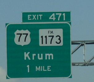Mileage sign on NB I-35. BGS on NB I-35. Guide markers in Denton. Street sign at a service road along I-35 in Denton.
