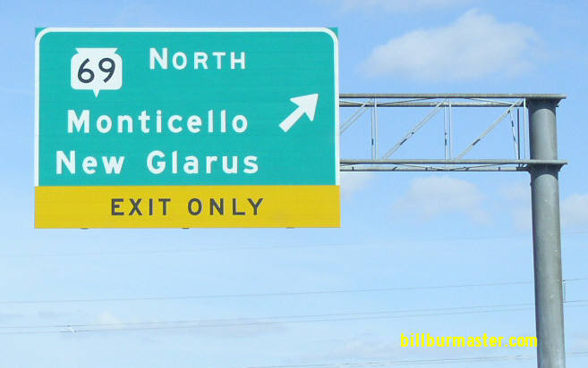 SB WI St Rt 69 south of the Dane/Green County Line. A guide markers on EB WI St Rt 39. Photo from: Paul Dienhart SB WI St Rt 69 south of New Glarus. SB WI St Rt 69 near Monticello. SB WI St Rt 69 south of Monticello. SB WI St Rt 69 in Central Green County. SB WI St Rt 69 near Monroe. A BGS on EB WI St Rt 11/81; NB WI St Rt 69. A BGS on WB WI St Rt 11/81; SB WI St Rt 69. SB WI St Rt 69 in Monroe. SB WI St Rt 69 south of Monroe. SB WI St Rt 69 near the Illinois/Wisconsin State Line. NB WI St Rt 69 at the Illinois/Wisconsin State Line.